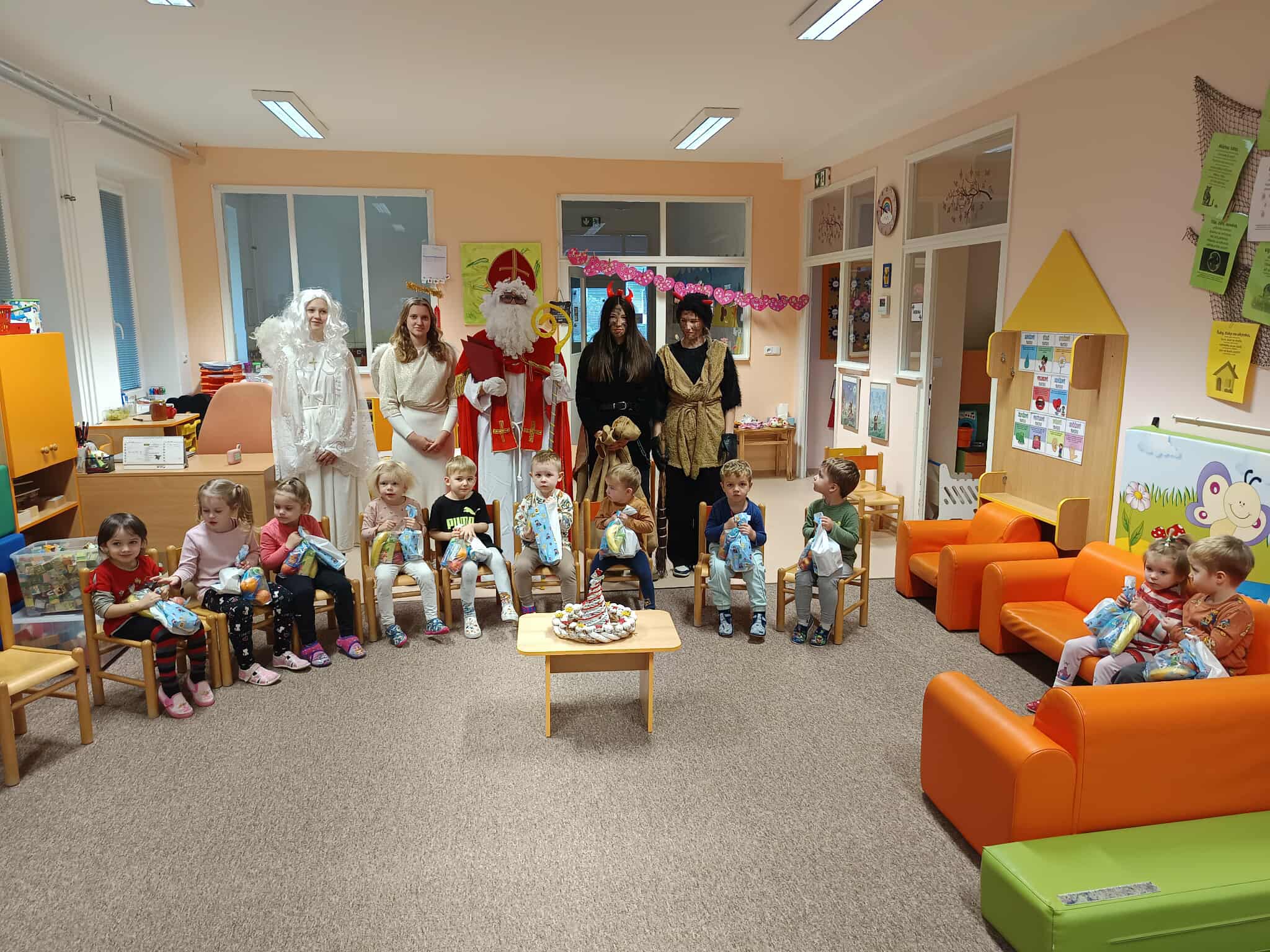 Včera nás ve školce navštívil Mikuláš. Přišel se dvěma andílky a dvěma čerty, kteří jen tiše cinkali řetězy. Mikuláš řekl, že jsme byli šikovní, tak jsme mu zazpívali. Potom nám všem dal balíček plný dobrot. Bylo to moooooc fajn!